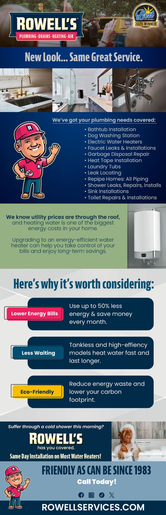 "Friendly As Can Be Since 1983!" When you need help with your plumbing, drains, heating, cooling or electrical in Concord, you can always rely on Rowell's Services! Call us now or book online!