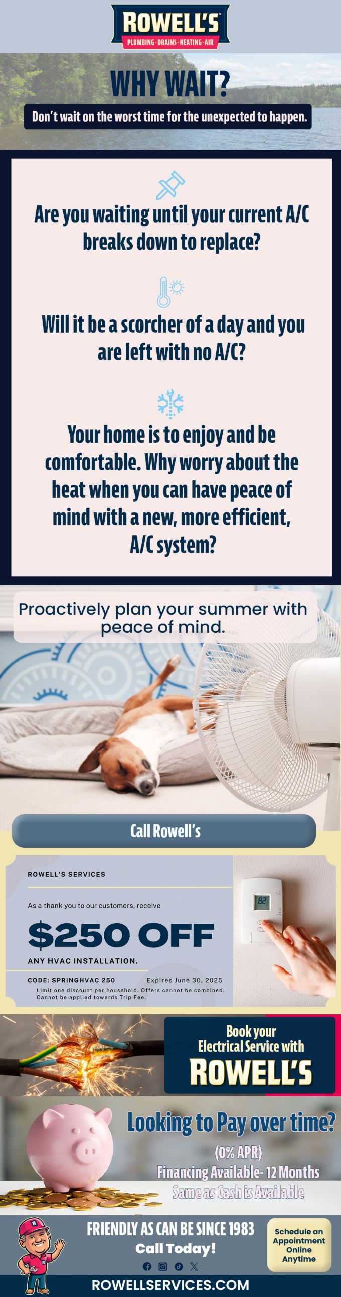 "Friendly As Can Be Since 1983!" When you need help with your plumbing, drains, heating, cooling or electrical in Concord, you can always rely on Rowell's Services! Call us now or book online!
