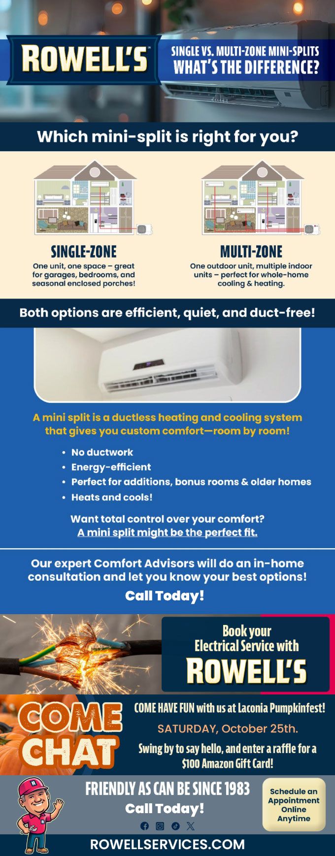 "Friendly As Can Be Since 1983!" When you need help with your plumbing, drains, heating, cooling or electrical in Concord, you can always rely on Rowell's Services! Call us now or book online!